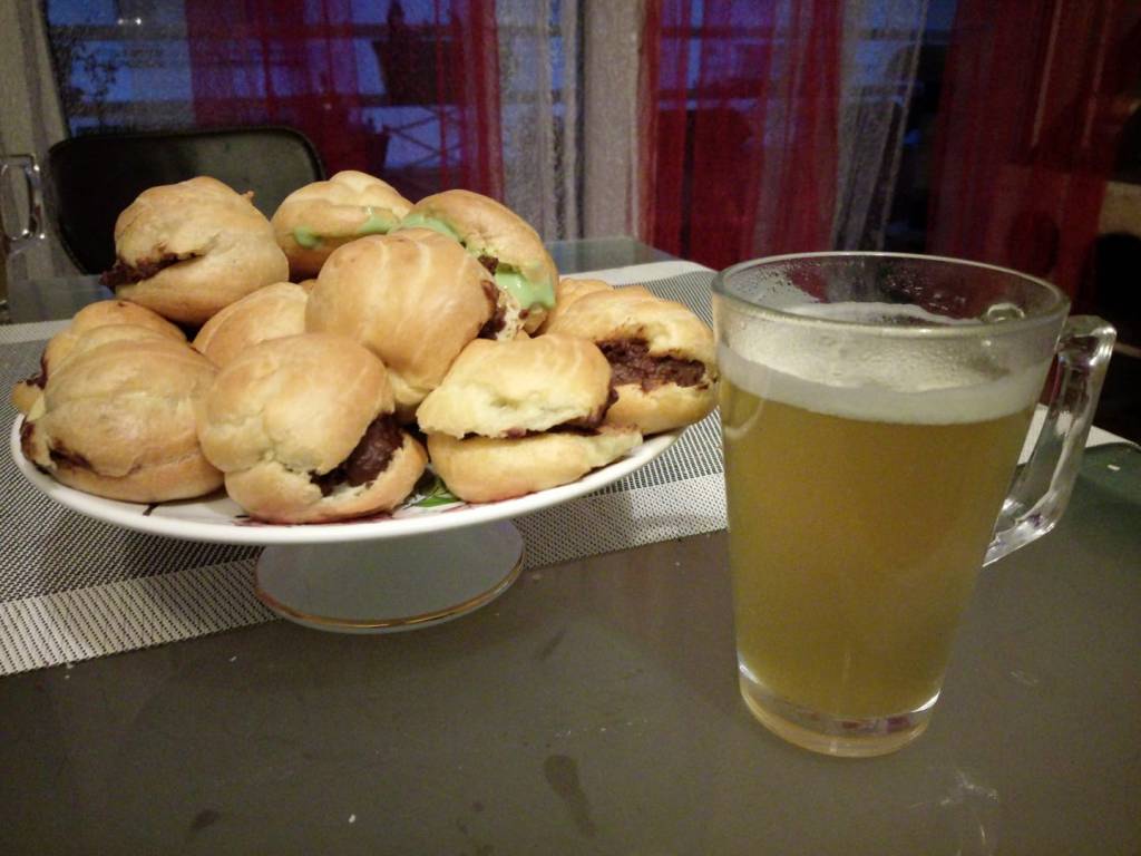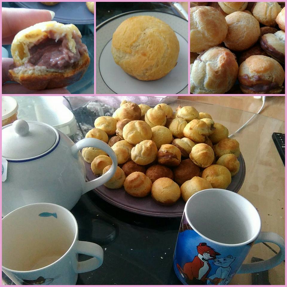 Fourrer avec la crème tiédie. Soit avec un douille ou si comme moi vous avez pas la patience couper légèrement le choux et y mettre la crème à la cuillère.