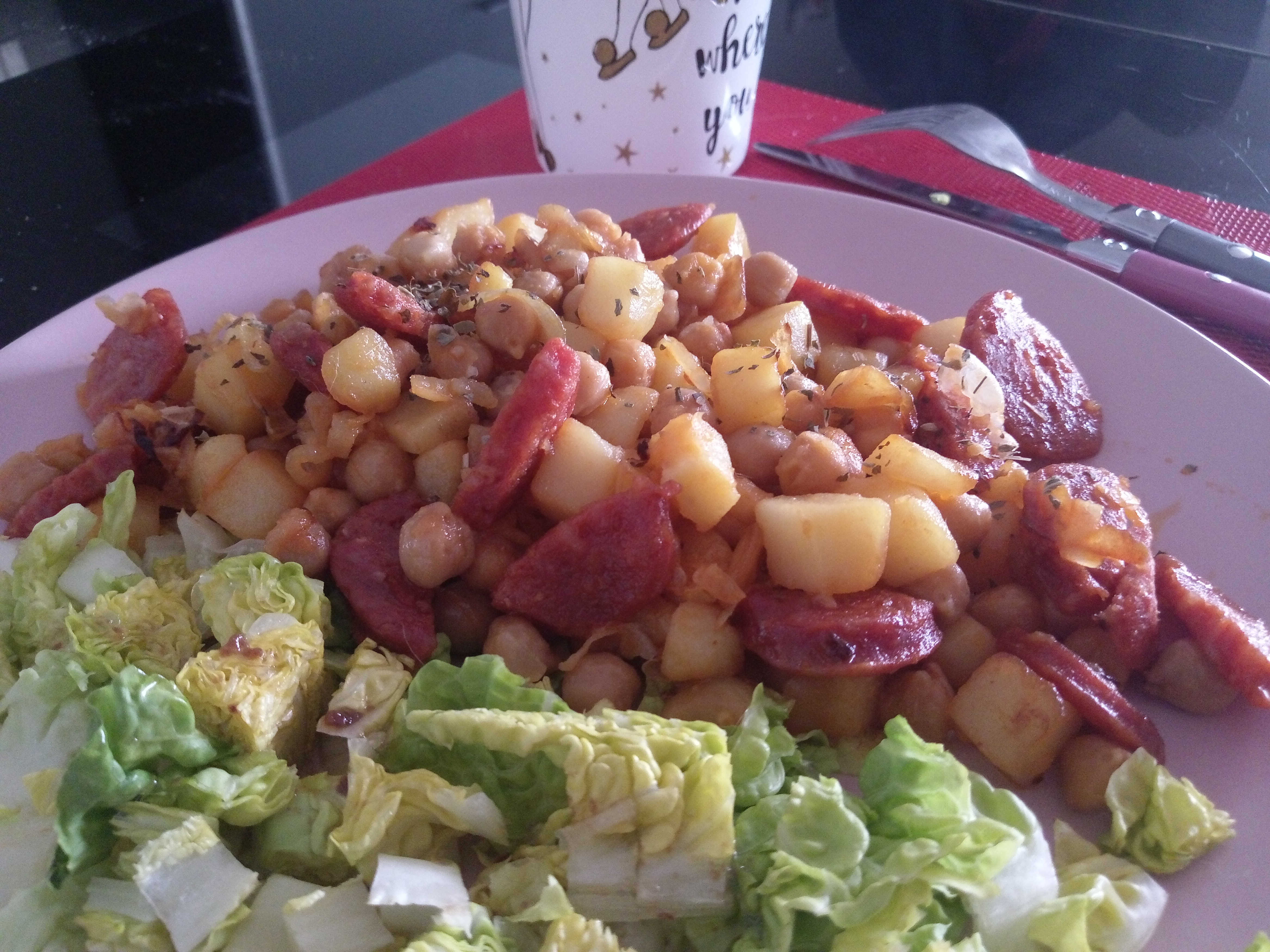 Ajouter dans la sauteuse le chorizo coupé et les pois chiches avec les pommes de terre