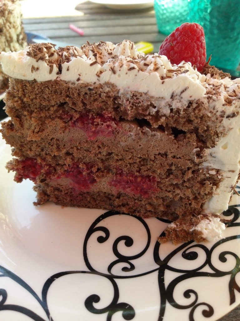 Décorer avec les framboises restantes et des copeaux de chocolat